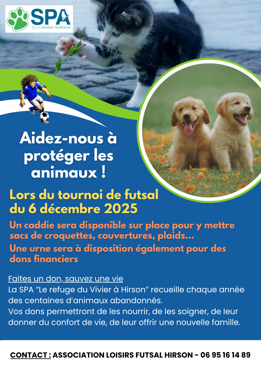 Un tournoi qui se deroulera le samedi 6 décembre à la salle Dropsy à Hirson à partir de 18h. L'argent récolté lors de la soirée sera redistribué à la SPA d'Hirson.